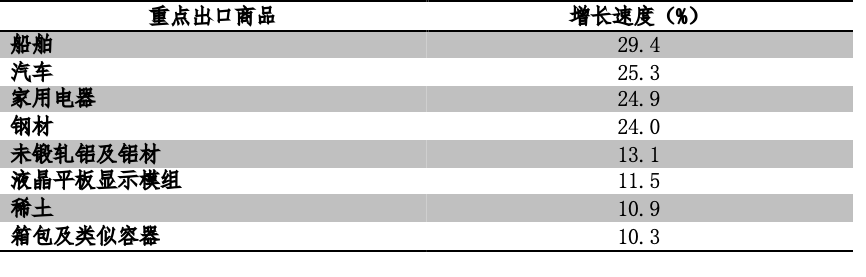 1-6月份,累計出口數(shù)量增長速度超過10%的重點商品共有8類,即船舶出口增長29.4%,汽車出口增長25.3%,家用電器出口增長24.9%,鋼材出口增長24.0%,未鍛軋鋁及鋁材出口增長13.1%,液晶平板顯示模組出口增長11.5%,稀土出口增長10.9%,箱包及類似容器出口增長10.3%。