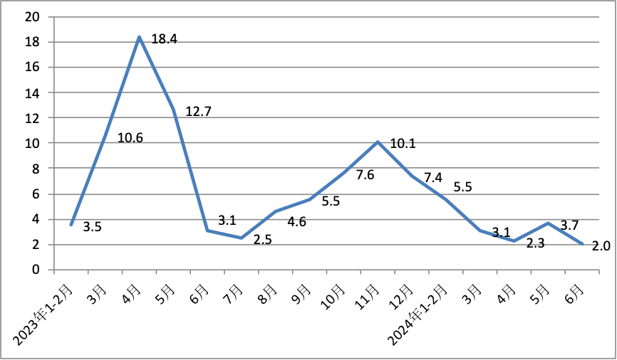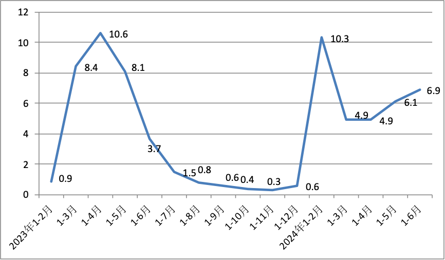1-6月份規(guī)模以上工業(yè)增加值同比增長6.0%,比上年全年增長4.6%回升1.4個百分點,比上年同期增長3.8回升2.2個百分點,更為可喜的是今年以來各月的增速都延續(xù)了上年后兩個月6.0%及以上的增速。1-5月份規(guī)模以上工業(yè)企業(yè)實現(xiàn)利潤總額同比增長3.4%,累計不僅保持了持續(xù)增長的勢頭,而且還扭轉(zhuǎn)了2022年7月到上年末連續(xù)下降的局面。
