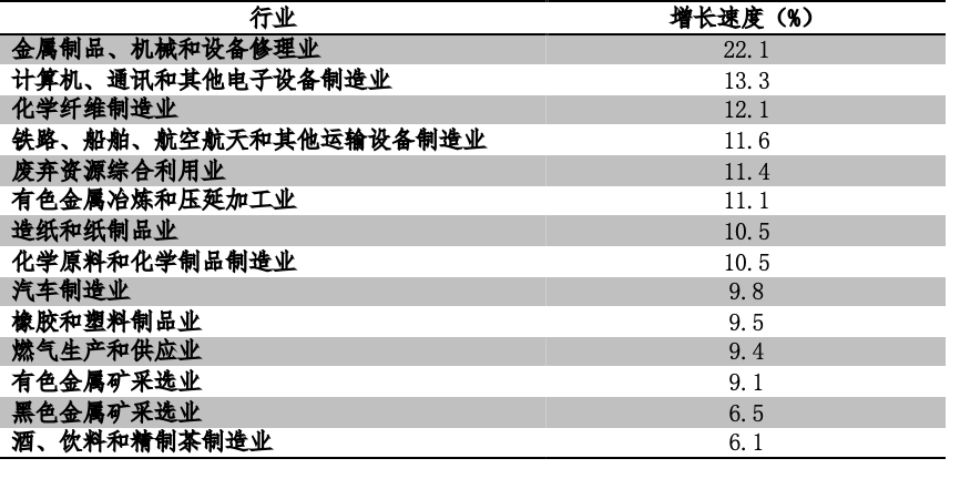 1-6月份規(guī)模以上工業(yè)增速超過6.0%的大類行業(yè)共有14類,即金屬制品、機械和設備修理業(yè)同比增長22.1%,計算機、通信和其他電子設備制造業(yè)增長13.3%,化學纖維制造業(yè)增長12.1%,鐵路、船舶、航空航天和其他運輸設備制造業(yè)增長11.6%,廢棄資源綜合利用業(yè)增長11.4%,有色金屬冶煉和壓延加工業(yè)增長11.1%,造紙和紙制品業(yè)增長10.5%,化學原料和化學制品制造業(yè)增長10.5%,汽車制造業(yè)增長9.8%,橡膠和塑料制品業(yè)增長9.5%,燃氣生產(chǎn)和供應業(yè)增長9.4%,有色金屬礦采選業(yè)增長9.1%,黑色金屬礦采選業(yè)增長6.5%,酒、飲料和精制茶制造業(yè)增長6.1%。