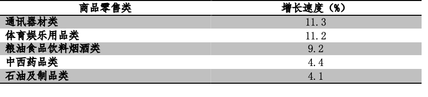 1-6月份累計限上商品零售額增速超過3.7%共有5類, 即通訊器材類增長11.3%,體育娛樂用品類同比增長11.2%,,糧油食品飲料煙酒類增長9.2%,中西藥品類增長4.4%,石油及制品類增長4.1%。