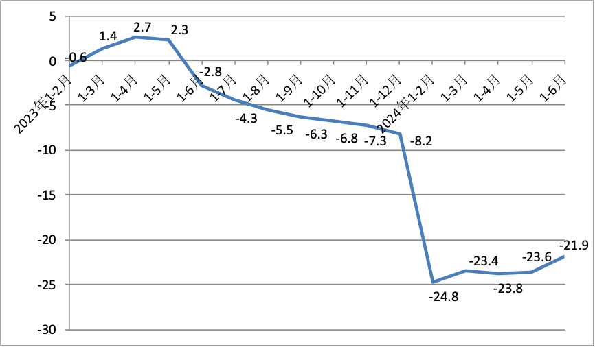 1-6月份商品房銷售面積同比下降19.0%,比上年全年下降8.5%擴大10.5個百分點,比上年同期下降5.3%擴大13.7個百分點,其中占比較高的商品住宅銷售面積降幅更大,1-6月份商品住宅銷售面積累計同比下降21.9%,比上年全年累計下降8.2%擴大13.7個百分點,比上年同期累計下降2.8%擴大19.1個百分點。