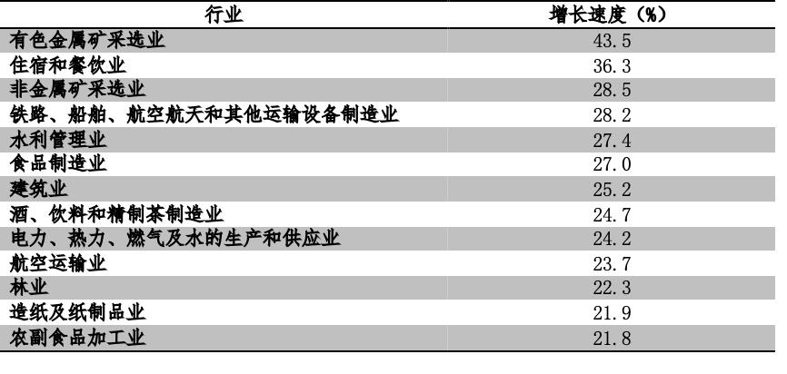 1-6月份固定資產(chǎn)投資增速超過20%的行業(yè)共13個,即有色金屬礦采選業(yè)同比增長43.5%,住宿和餐飲業(yè)增長36.3%,非金屬礦采選業(yè)增長28.5%,鐵路、船舶、航空航天和其他運輸設備制造業(yè)增長28.2%,水利管理業(yè)增長27.4%,食品制造業(yè)增長27.0%,建筑業(yè)增長25.2%,酒、飲料和精制茶制造業(yè)增長24.7%,電力、熱力、燃氣及水的生產(chǎn)和供應業(yè)增長24.2%,航空運輸業(yè)增長23.7%,林業(yè)增長22.3%,造紙及紙制品業(yè)增長21.9%,農(nóng)副食品加工業(yè)增長21.8%。