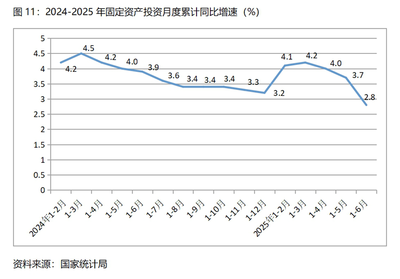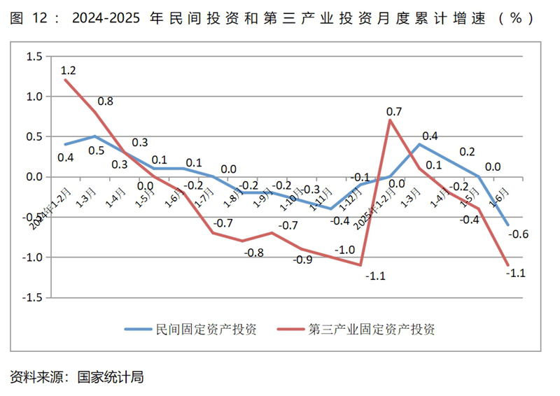 (二)民間投資和第三產(chǎn)業(yè)投資增速均由增長(zhǎng)轉(zhuǎn)為下降,餐飲收入增速回落較多。上半年民間固定資產(chǎn)投資同比下降0.6%,一季度為增長(zhǎng)0.4%,這是自2023年9月以來(lái)月度累計(jì)的最大降幅;第三產(chǎn)業(yè)固定資產(chǎn)投資同比下降1.1%,一季度為增長(zhǎng)0.1%,這是今年以來(lái)月度累計(jì)的最大降幅;餐飲收入同比增長(zhǎng)4.3%,比一季度增長(zhǎng)4.7%回落了0.4個(gè)百分點(diǎn),比上年同期增長(zhǎng)7.9%回落3.6個(gè)百分點(diǎn)。這些指標(biāo)增速的變化需引起宏觀調(diào)控政策的高度關(guān)注。