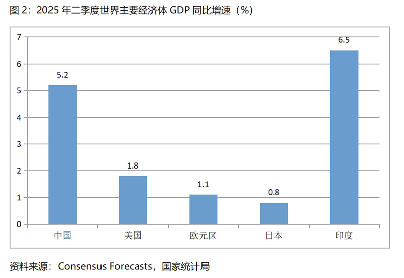 二季度5.2%的經(jīng)濟(jì)增速在世界上是比較快的增速。根據(jù)Consensus Forecasts 最新預(yù)測(cè)數(shù)據(jù),今年二季度美國(guó)GDP同比將增長(zhǎng)1.8%,歐元區(qū)將增長(zhǎng)1.1%,日本將增長(zhǎng)0.8%,印度將增長(zhǎng)6.5%,我國(guó)仍然是世界主要經(jīng)濟(jì)體中經(jīng)濟(jì)增長(zhǎng)比較快的國(guó)家。
