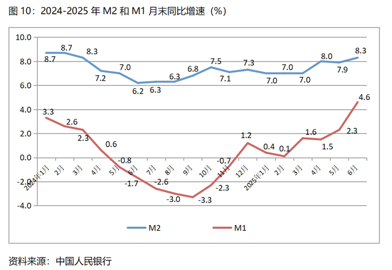 (五)廣義貨幣供應(yīng)量(M2)增速比一季度末和上年同期均保持回升,狹義貨幣供應(yīng)量(M1)增速比一季度末和上年同期也均保持回升。6月末,廣義貨幣供應(yīng)量同比增長(zhǎng)8.3%,比一季度末增長(zhǎng)7.0%回升了1.3個(gè)百分點(diǎn),比上年同期增長(zhǎng)6.2%回升了2.1個(gè)百分點(diǎn),總體保持了今年以來(lái)持續(xù)回升的勢(shì)頭;6月末,狹義貨幣供應(yīng)量同比增長(zhǎng)4.6%,比一季度末增長(zhǎng)1.6%回升了3.0個(gè)百分點(diǎn),而上年同期為下降1.7%。說(shuō)明今年以來(lái)的貨幣政策較好地堅(jiān)持了適度寬松的方向,為經(jīng)濟(jì)運(yùn)行提供了較為寬松的流動(dòng)性,但從微觀經(jīng)營(yíng)主體活力不足和價(jià)格低位運(yùn)行看,貨幣政策還有進(jìn)一步寬松的必要。