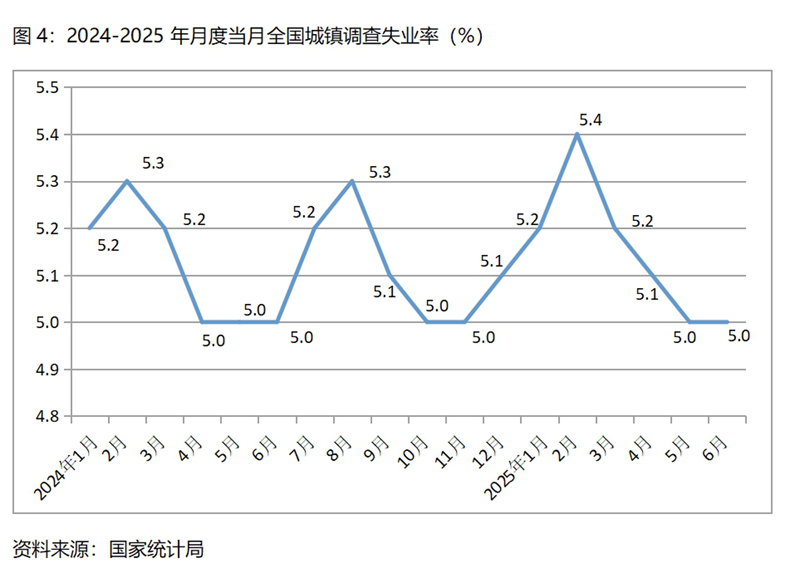 (三)調(diào)查失業(yè)率比一季度下降,比上年同期上升。上半年平均調(diào)查失業(yè)率為5.2%,比一季度平均調(diào)查失業(yè)率的5.3%下降 0.1個(gè)百分點(diǎn),比上年同期的5.1%上升了0.1個(gè)百分點(diǎn)。其中,1月份為5.2%,2月份為5.4%,3月份為5.2%,4月份為5.1%,5月份為5.0%,6月份為5.0%,呈現(xiàn)出動(dòng)態(tài)變化走低的態(tài)勢(shì)。