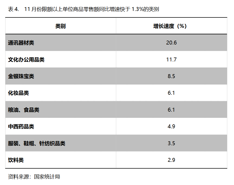 11月份,限額以上單位商品零售額同比增速快于社會消費品零售總額1.3%增速的共有8類,即通訊器材類增長20.6%,文化辦公用品類增長11.7%,金銀珠寶類增長8.5%,化妝品類增長6.1%,糧油、食品類增長6.1%,中西藥品類增長4.9%,服裝、鞋帽、針紡織品類增長3.5%,飲料類增長2.9%。
