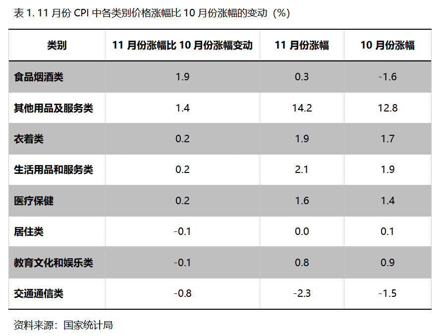 11月份,在CPI 8個類別中有5個類別同比漲幅回升,3個類別回落。漲幅回升的5個類別包括食品類價格由降轉漲、漲幅回升1.9個百分點,其他用品和服務類漲幅回升1.4個百分點,衣著類、生活用品及服務類和醫(yī)療保健類漲幅均回升0.2個百分點;居住類、教育文化和娛樂類漲幅均回落0.1個百分點,交通通訊類降幅擴大0.8個百分點。