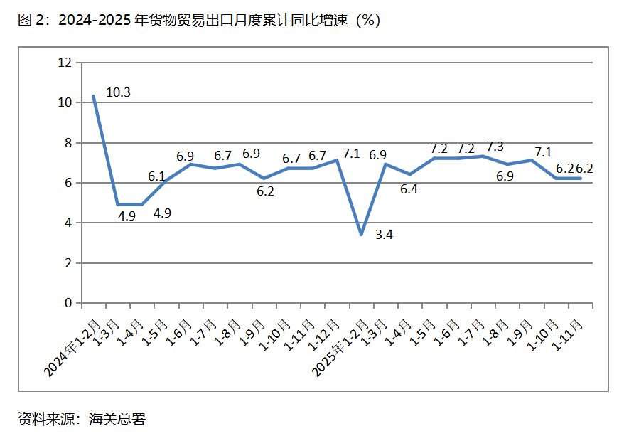 二、出口增速由落轉平。1-11月份,貨物出口同比增長6.2%,與1-10月份增長6.2%持平,1-10月份比1-9月份增長7.1%回落0.9個百分點。貨物出口對主要貿易出口經濟體增速有升有落有平,1-11月份對歐盟出口同比增長8.9%,比1-10月份對歐盟出口同比增長8.4%回升0.5個百分點;對美國出口下降18.3%,比1-10月份下降17.1%擴大1.2個百分點;對東盟出口增長14.6%,比1-10月份增長15.3%回落0.7個百分點;對拉丁美洲出口增長7.9%,比1-10月份增長7.3%回升0.6個百分點;對非洲出口增長27.2%,與1-10月份增長27.2%持平。貨物出口在跌宕起伏的國際形勢下仍保持穩(wěn)定增長,彰顯出我國對外貿易的較強韌性。