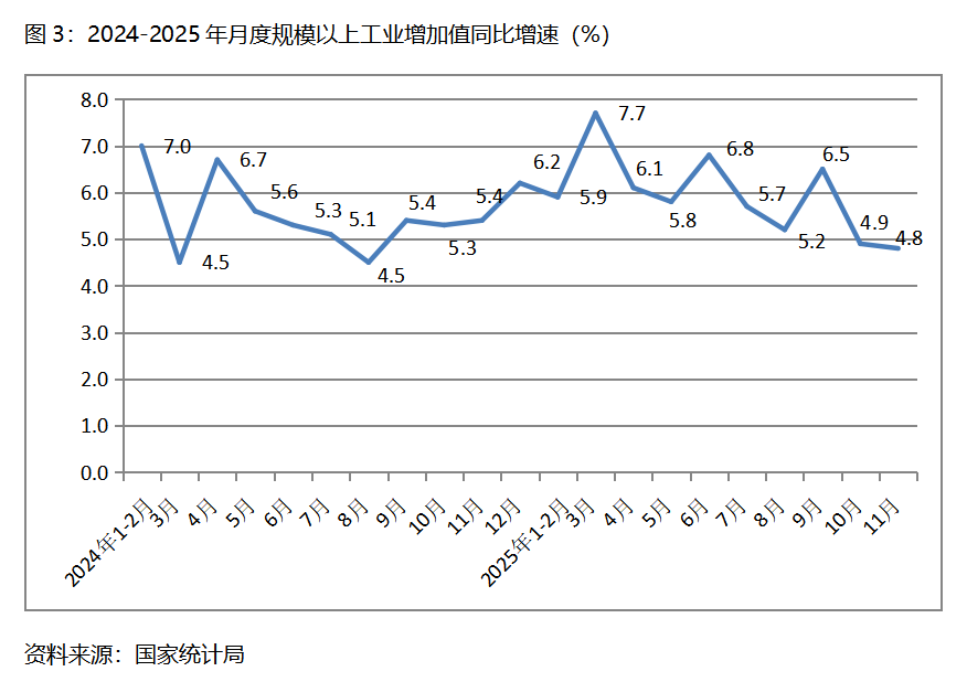 三、工業(yè)增速持續(xù)回落。11月份,規(guī)模以上工業(yè)增加值同比增長4.8%,比10月份增長4.9%回落了0.1個百分點,10月份比9月份增長6.5%回落了1.6個百分點。從工業(yè)三大門類看,采礦業(yè)增速比上月回升,制造業(yè)和電力、熱力、燃氣及水生產和供應業(yè)增速回落,11月份,采礦業(yè)同比增長6.3%,比上月增長4.5%回升1.8個百分點;制造業(yè)增長4.6%,比上月增長4.9%回落0.3個百分點;電力、熱力、燃氣及水生產和供應業(yè)增長4.3%,比上月增長5.4回落1.1個百分點。