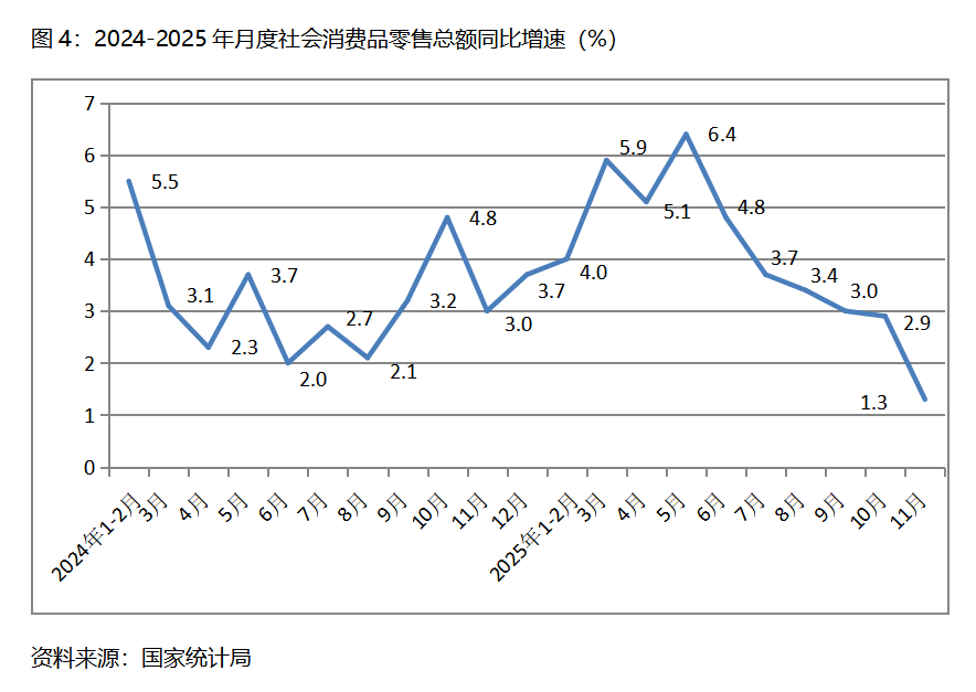 四、零售增速持續(xù)回落。11月份,社會消費品零售總額同比增長1.3%,比10月份增長2.9%回落了1.6個百分點,10月份比9月份增長3.0%回落了0.1個百分點,其中,餐飲收入和商品零售額增速均出現了回落,10月份餐飲收入同比增長3.2%,比10月份增長3.8%回落了0.6個百分點;商品零售額增長1.0%,比10月份增長2.8%回落1.8個百分點。社會消費品零售總額增速的持續(xù)回落,需要引起高度關注。