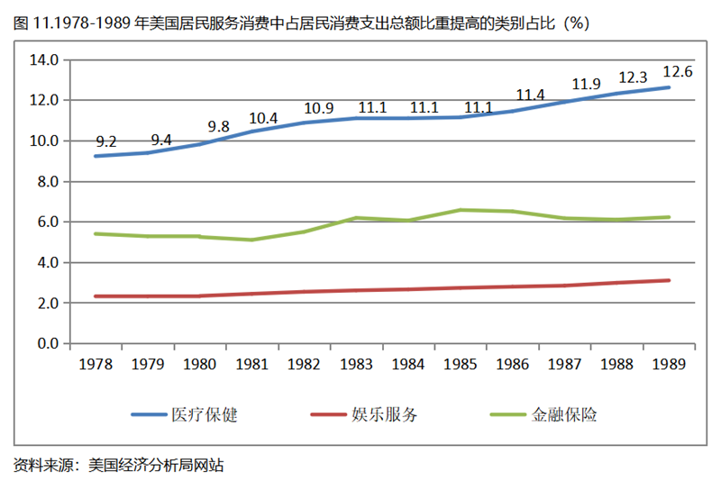 由于數據來源的原因,重點將看一下美國居民服務消費類別在人均GDP超過1萬美元后的變化情況。美國居民服務消費共有7個大類別,在1978-1989年期間占居民消費支出總額比重提高的有3個類別,分別是醫(yī)療保健、娛樂服務和金融保險,醫(yī)療保健占居民消費支出總額的比重提高了3.4個百分點,娛樂服務和金融保險占居民消費支出總額的比重均提高了0.8個百分點。