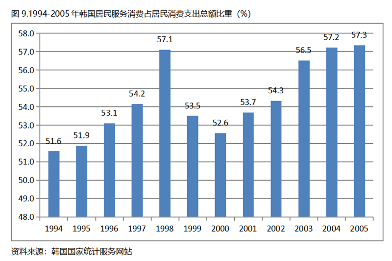 美國、日本和韓國在人均GDP超過1萬美元后,居民服務消費占居民消費支出總額比重的持續(xù)提高,居民耐用品消費和非耐用品消費占居民消費支出總額比重的總體下降,給出的一個重要啟示,就是提高居民消費率要聚焦在居民服務消費上發(fā)力。