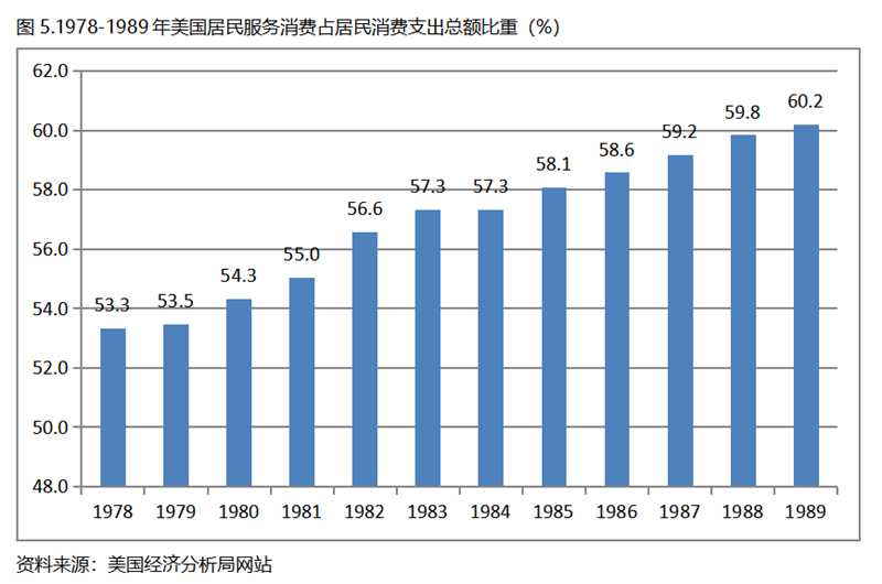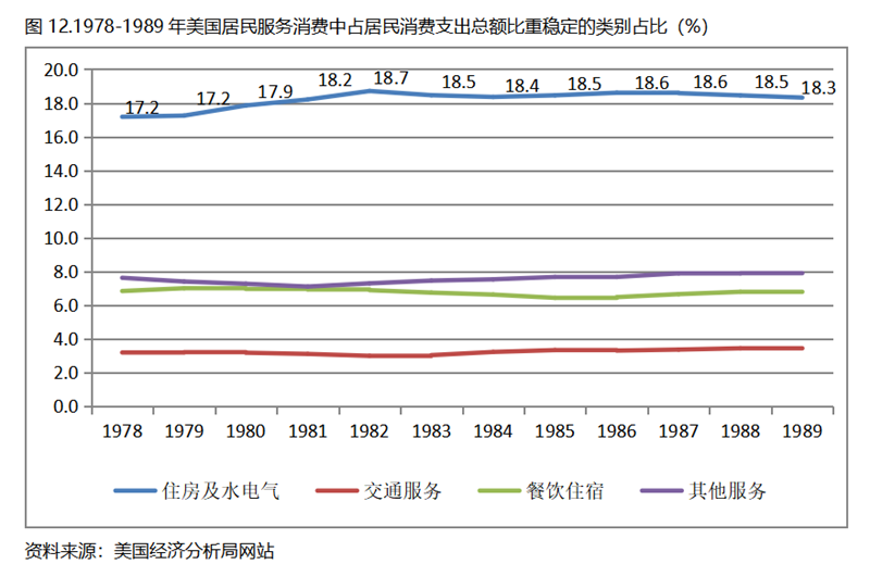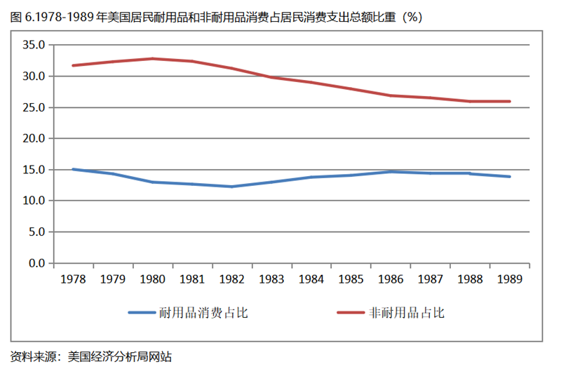 美國在人均GDP超過1萬美元后的1978-1989年期間,居民服務消費占居民消費支出總額持續(xù)提高,而居民耐用品消費占居民消費支出總額比重、非耐用品消費占居民消費支出總額比重均呈現(xiàn)下降趨勢。
