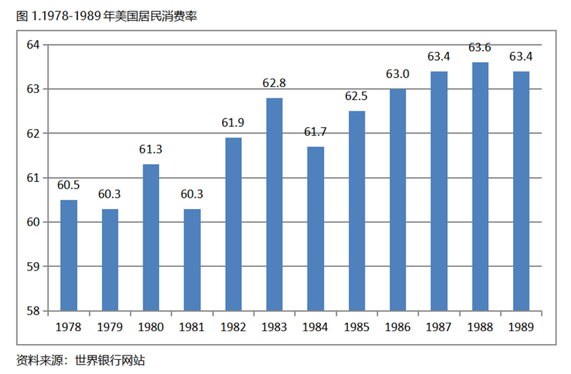 美國是1978年人均GDP超過1萬美元的,在1978-1989年的12年期間(選擇12個年份目的是與“十五五”時間跨度相對應,下同),居民消費率雖然有波動,但總體是在高位上呈現(xiàn)出提高的走勢,1989年比1978年提高了2.9個百分點。