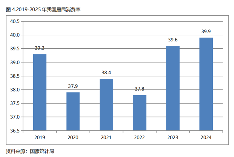 我國是2019年人均GDP超過1萬美元的,在2019-2024年的5年期間,居民消費率也呈現(xiàn)先落后升的走勢,總體上看是在低位上保持著穩(wěn)定的態(tài)勢,2024年比2019升0.6個百分點。需要指出的,我國居民消費率在人均GDP超過1萬美元后,雖然也保持總體的穩(wěn)定,但明顯處于較低水平。