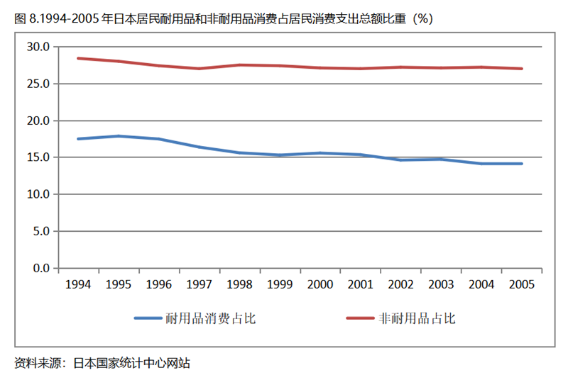 日本在人均GDP超過1萬美元后的1994-2005年期間,居民服務消費占居民消費支出總額持續(xù)提高,而居民耐用品消費占居民消費支出總額比重、非耐用品消費占居民消費支出總額比重均呈現(xiàn)下降趨勢。