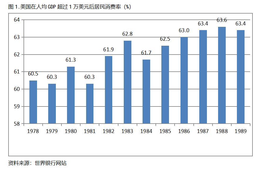 美國(guó)在人均GDP超過1萬美元后的12年期間注,居民消費(fèi)率一直保持在60.0%以上,同時(shí)還呈現(xiàn)出總體持續(xù)提高的趨勢(shì)。美國(guó)在1978年人均GDP超過1萬美元,當(dāng)年居民消費(fèi)率為60.5%,此后總體保持了持續(xù)提高的態(tài)勢(shì),12年后的1989年提高到63.4%,提高了2.9個(gè)百分點(diǎn)。