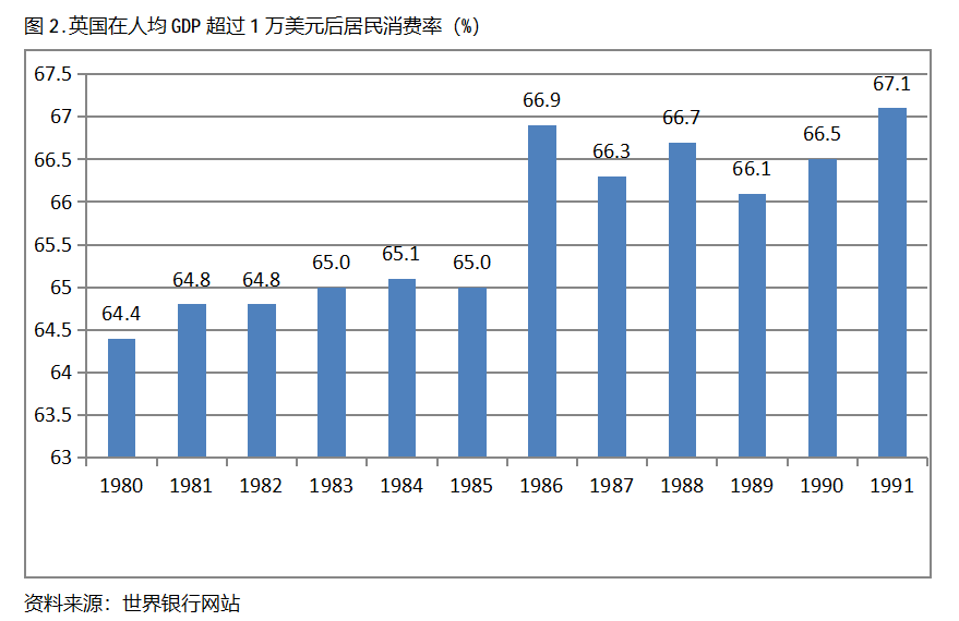 英國(guó)在人均GDP超過1萬美元后的12年期間,居民消費(fèi)率一直保持在64.0%以上,同時(shí)也呈現(xiàn)出總體持續(xù)提高的趨勢(shì)。英國(guó)在1980年人均GDP超過1萬美元,當(dāng)年居民消費(fèi)率為64.4%,此后總體保持了持續(xù)提高的態(tài)勢(shì),12年后的1991年提高到67.1%,提高了2.7個(gè)百分點(diǎn)。